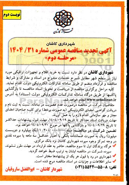 شهرداری کاشان در نظر دارد نسبت به خرید اقلام و تجهیزات ترافیکی مورد نیاز در سطح شهر مطابق شرح خدمات مندرج در اسناد و مدارک و شرایط مناقصه و قرارداد منضم از طریق سامانه تدارکات الکترونیکی دولت اقدام نماید .