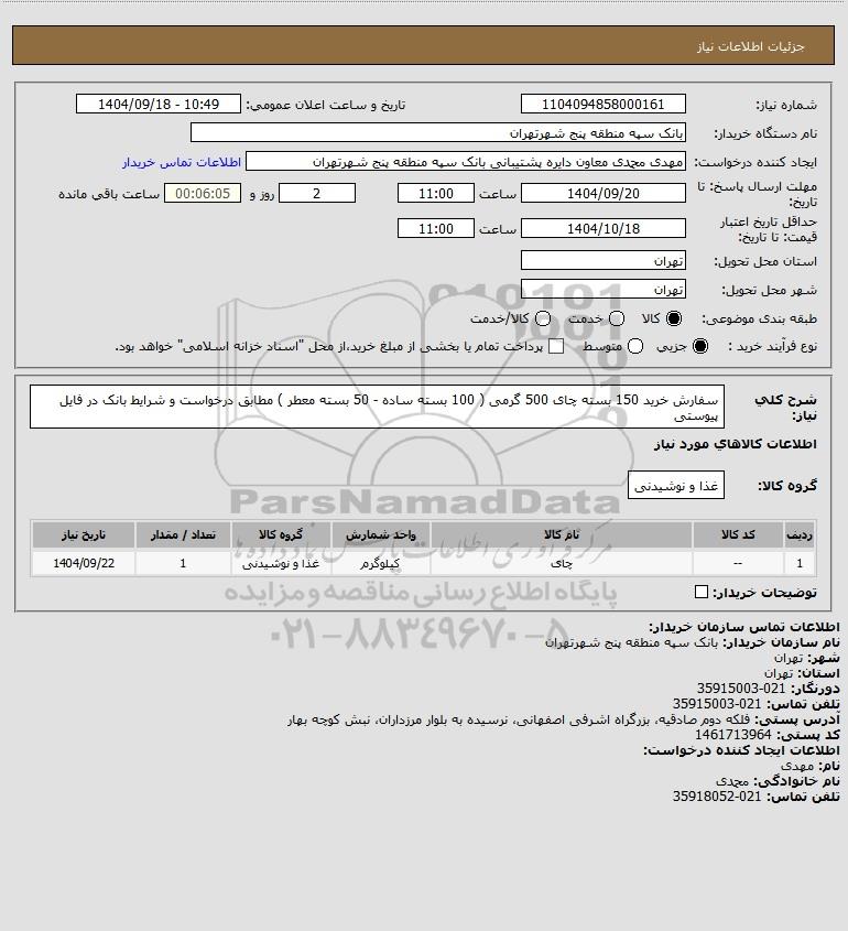 شرح کلی نیاز: سفارش خرید 150 بسته چای 500 گرمی ( 100 بسته ساده - 50 بسته معطر ) مطابق درخواست و شرایط بانک در فایل پیوستی