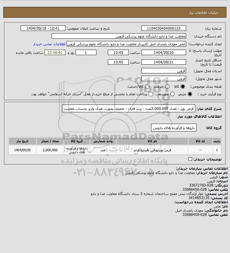 شرح کلی نیاز: قرص بوپر - تعداد 2.000.000عدد - برند فاران - تخفیف بصورت نقدی واریز بحساب معاونت