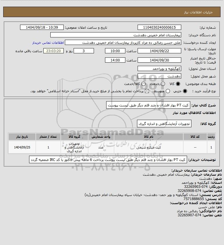 استعلام بها و موضوع استعلام استعلام کیت PT بهار افشان و چند قلم دیگر طبق لیست پیوست به اطلاع کلیه شرکتها و افراد متخصص واجد شرایط میرساند، آگهی گذار در نظر دارد از طریق استعلام بها، نسبت به انتخاب و دریافت پیشنهادات اقدام نماید. این استعلام با کد آگهی ثبت شده در سامانه خبرگزاری پارس نماد : 9968153 منتشر شده است. مشخصات استعلام : تاریخ شروع استعلام: 1404/09/18 آخرین مهلت ارسال پیشنهاد قیمت : 1404/09/22 و محل اجرای پروژه : استان کهگیلویه و بویراحمد میباشد. استعلام قیمت مورد درخواست : استعلام کیت PT بهار افشان و چند قلم دیگر طبق لیست پیوست با دستهبندیهای تخصصی و گروه های مرتبط : خدمات و تجهیزات آزمایشگاهی و پزشکی, استعلام اطلاع رسانی میگردد.