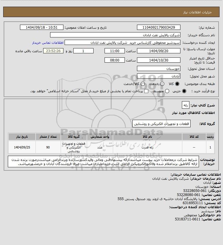 | 1 | -- | رله قدرت | عدد | قطعات و تجهیزات الکتریکی و روشنایی | 90 | 1404/09/25 |