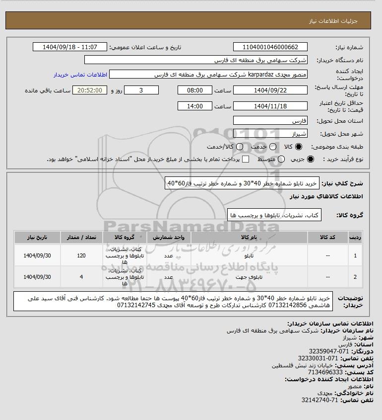 توضیحات خریدار:خرید تابلو شماره خطر 40*30 و شماره خطر ترتیب فاز60*40 پیوست ها حتما مطالعه شود. کارشناس فنی آقای سید علی هاشمی 07132142856 کارشناس تدارکات طرح و توسعه آقای محمدی 07132142745