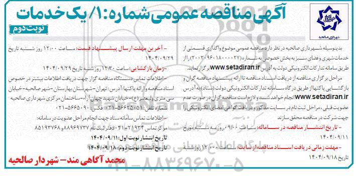بدینوسیله شهرداری صالحیه در نظر دارد مناقصه عمومی موضوع واگذاری قسمتی از خدمات شهری و فضای سبز به بخش خصوصی به شماره (2003096018000027) را از طریق سامانه تدارکات الکترونیکی دولت به آدرس سایت ستاد ایران برگزار نماید.