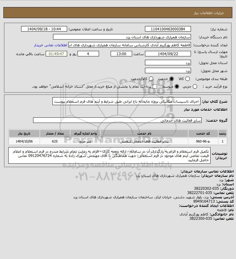 شرح کلی نیاز: اجرای تاسیسات مکانیکی پروژه چایخانه باغ ایرانی طبق شرایط و آیتم های فرم استعلام پیوست
