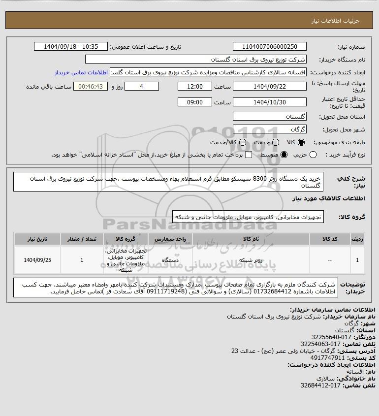 شرح کلی نیاز: خرید یک دستگاه روتر 8300 سیسکو مطابق فرم استعلام بهاء ومشخصات پیوست ،جهت شرکت توزیع نیروی برق استان گلستان