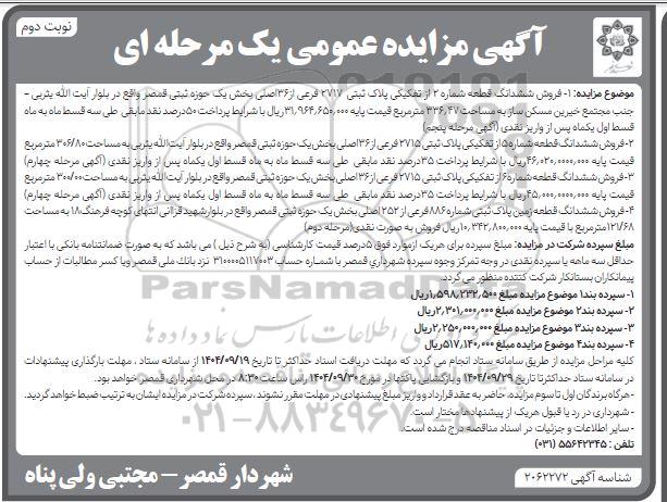 آگهی مزایده عمومی یک مرحله ای نوبت دوم