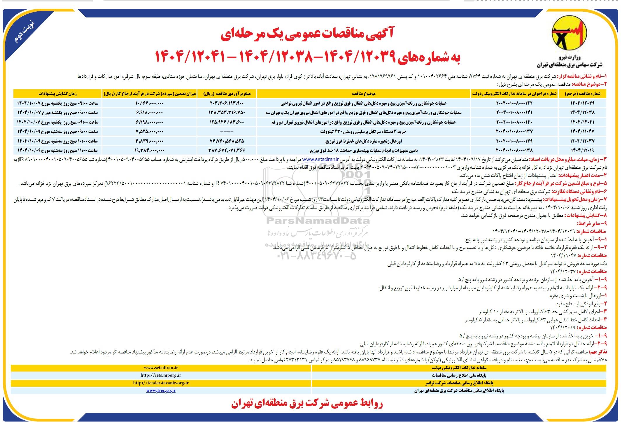 | 1203811044 | 2004001008000141 | عملیات جوشکاری و رنگ آمیزی پیچ و مهره دکل های انتقال و فوق توزیع واقع در امورهای انتقال نیروی تهران یک و تهران سه | 138.353.316.750 | 6.918.000.000 | ساعت 9 صبح روز 1شنبه مورخ 1404.10.07 |