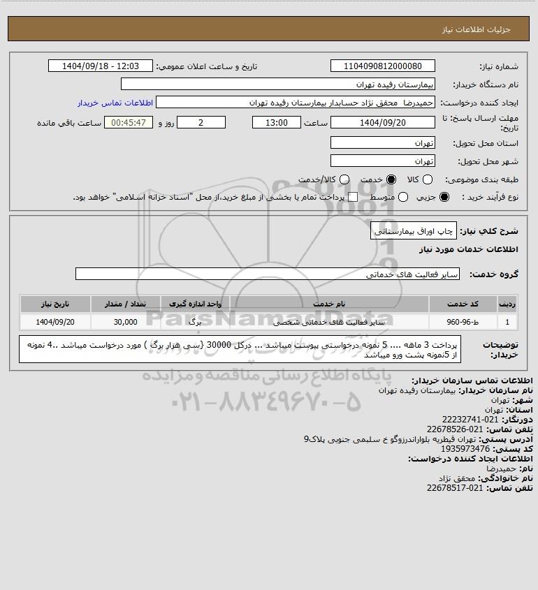 شرح کلی نیاز: چاپ اوراق بیمارستانی