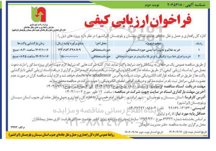 اداره کل راهداری و حمل و نقل جاده ایی جنوب استان سیستان و بلوچستان ایرانشهر در نظر دارد پروژه های ذیل را :