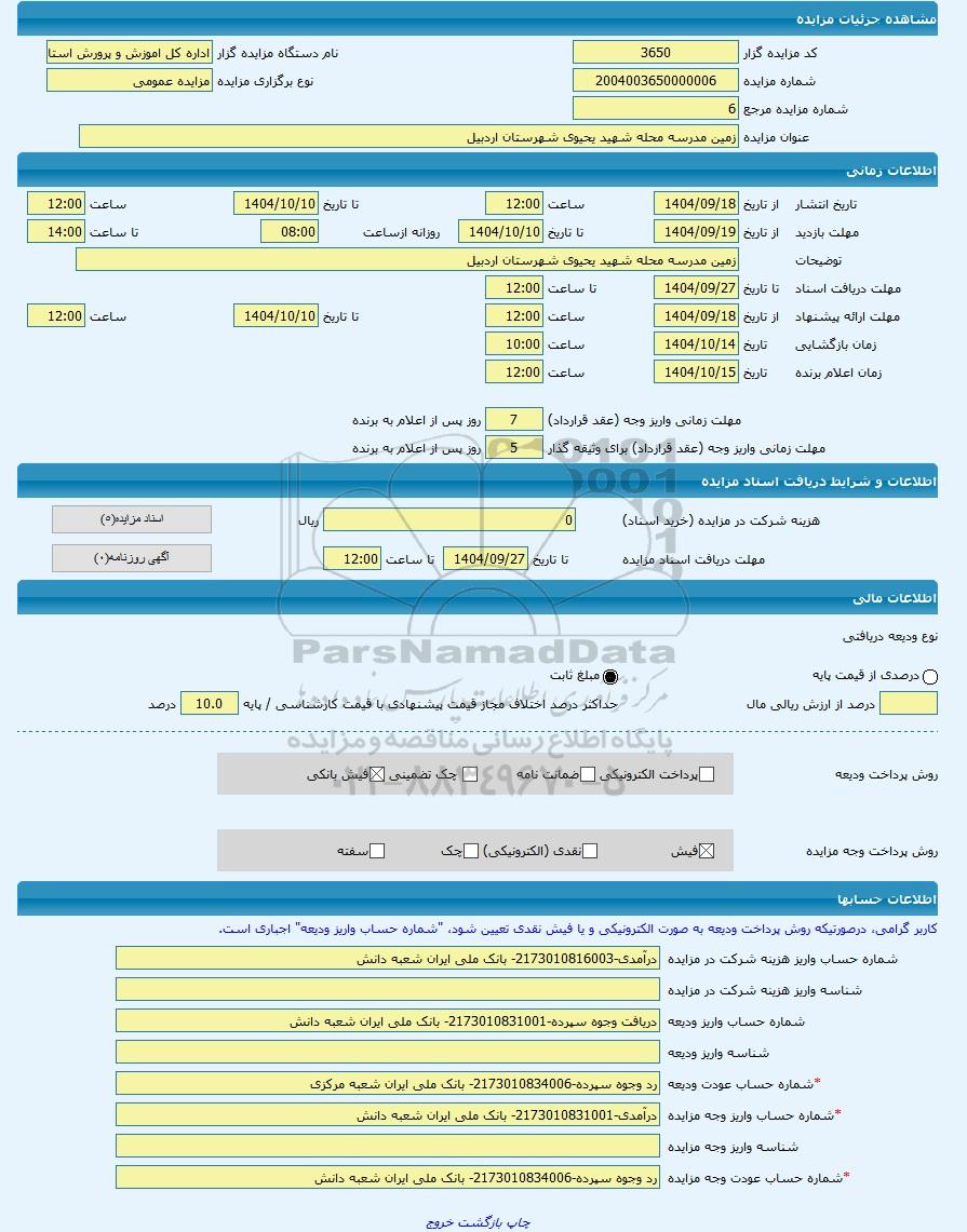 | عنوان مزایده | زمین مدرسه محله شهید یحیوی شهرستان اردبیل -مزایده زمین - استان اردبیل | |||