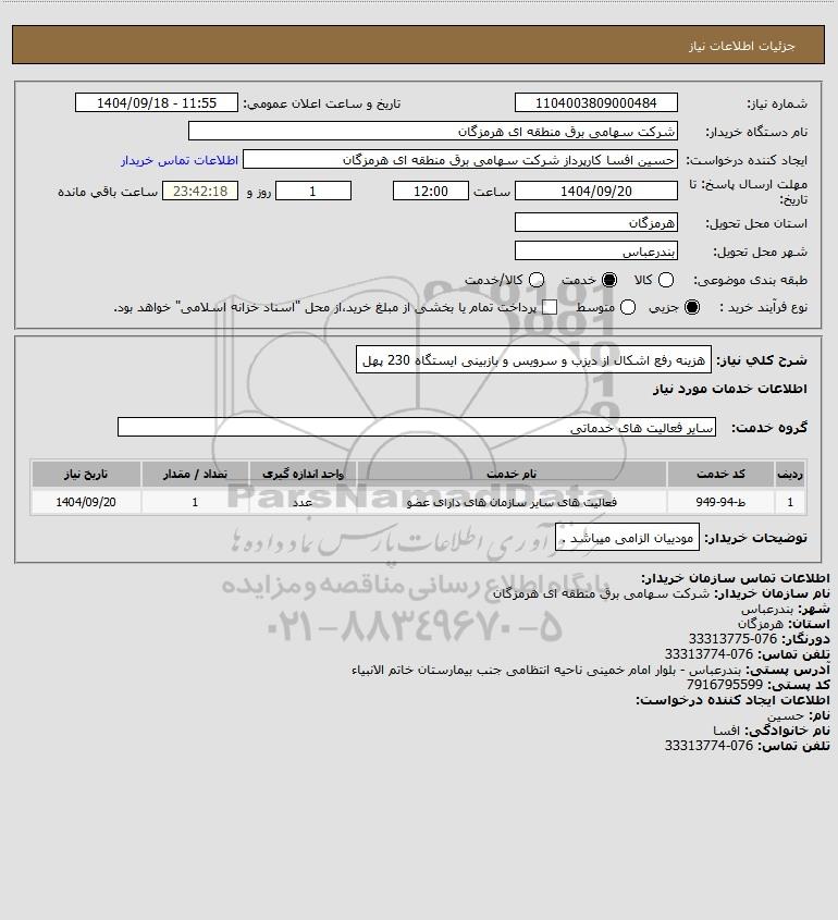 شرح کلی نیاز: هزینه رفع اشکال از دیزب و سرویس و بازبینی ایستگاه 230 پهل