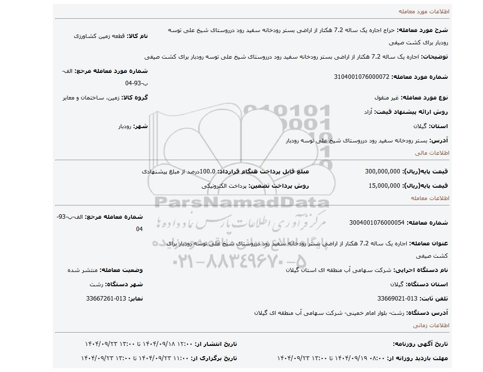 مزایده عمومی مزایده اجاره یک ساله 7.2 هکتار از اراضی بستر رودخانه سفید رود درروستای شیخ علی توسه رودبار برای کشت صیفی برگزار میگردد. از کلیه افراد متخصص و شرکتهای واجد شرایط دعوت به عمل میآید تا در این مزایده با کد خبرگزاری پارس نماد : 9969220 شرکت نمایند تاریخ شروع مزایده : 1404/09/18 مهلت شرکت در مزایده: تا پایان روز 1404/09/23 مکان برگزاری اموال واگذاری استانهای گیلان و دستهبندیهای مربوط به این حراجی ماشین آلات و تجهیزات کشاورزی و دام پروری, املاک و زمین میباشد.