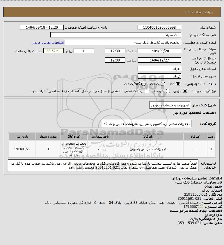 | 1 | -- | تجهیزات دسترسی رادیویی | عدد | تجهیزات مخابراتی، کامپیوتر، موبایل، ملزومات جانبی و شبکه | 1 | 1404/09/22 |