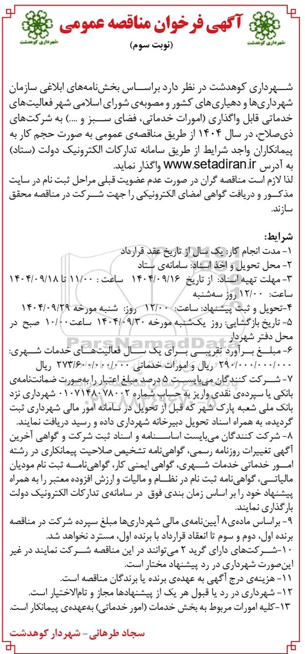 شهرداری کوهدشت در نظر دارد بر اساس بخش نامه های ابلاغی سازمان شهرداری ها و دهیاری های کشور و مصوبه ی شورای اسلامی شهر فعالیت های خدماتی قابل واگذاری (امورات خدماتی، فضای سبز و ....) به شرکت های ذی صلاح در سال 1404 از طریق مناقصه عمومی به صورت حجم کار به پیمانکاران واجد شرایط از طریق سامانه ی تدارکات الکترونیک دولت (ستاد) واگذار نماید.