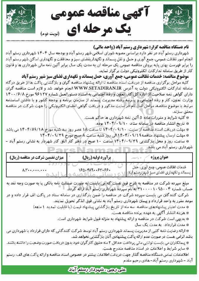 شهرداری رستم آباد در نظر دارد بر اساس مصوب شورای اسلامی شهر رستم آباد و بودجه سال 1404 شهرداری رستم آباد انجام امور نظافت عمومی، جمع آوری و حمل و نقل پسماند و محافظت و نگهداری فضای سبز و محافظت و نگهداری امکان شهر رستم آباد را برابر فهرست بهای پایه بروش مناقصه عمومی یک مرحله ای به مدت یک سال برابر آئین نامه مالی شهرداری ها و قانون کار از طریق سامانه تدارکات الکترونیکی دولت برگزار نماید.