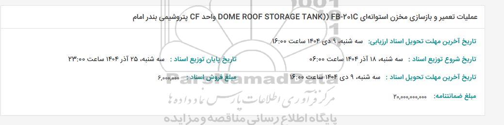 مناقصه عملیات تعمیر و بازسازی مخزن استوانه ای FB - 201C  DOME ROOF STORAGE TANK))  واحد CF پ -مناقصه روز سه شنبه هجدهم آذر ماه 1404, مناقصه عملیات تعمیر و بازسازی مخزن استوانه ای FB - 201C  DOME ROOF STORAGE TANK))  واحد CF پ