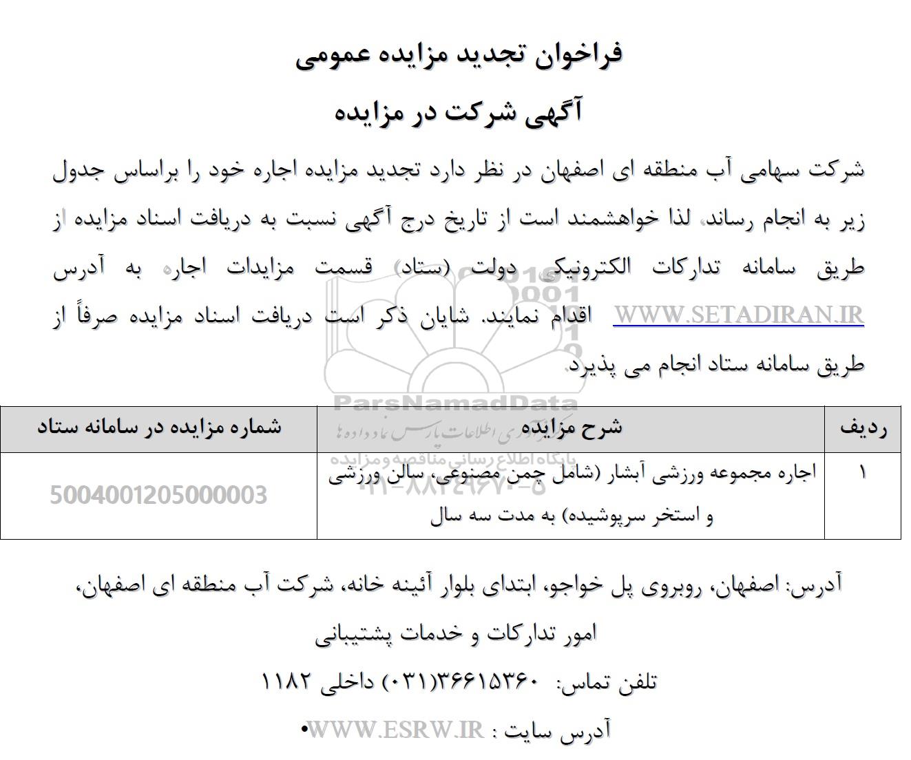 شرکت سهامی آب منطقه ای اصفهان در نظر دارد تجدید مزایده اجاره خود را براساس جدول زیر به انجام رساند. لذا خواهشمند است از تاریخ درج آگهی نسبت به دریافت اسناد مزایده از طریق سامانه تدارکات الکترونیک دولت (ستاد) قسمت مزایدات اجاره به آدرس ستاد ایران اقدام نمایند. شایان ذکر است دریافت اسناد مزایده صرفا از طریق سامانه ستاد انجام می پذیرد.