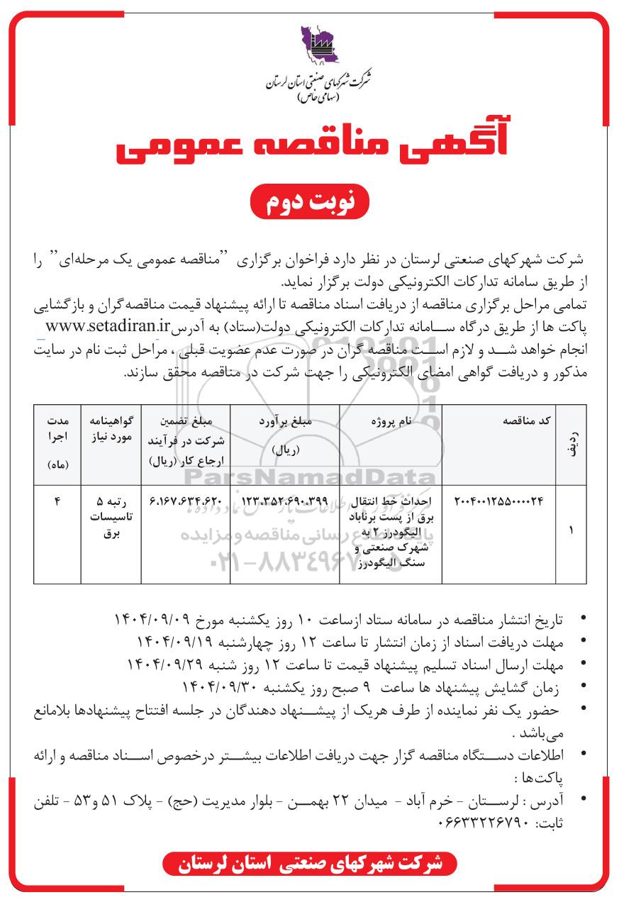 شرکت شهرکهای صنعتی لرستان در نظر دارد فراخوان برگزاری مناقصه عمومی یک مرحله ای را از طریق سامانه تدارکات الکترونیکی دولت برگزار نماید.