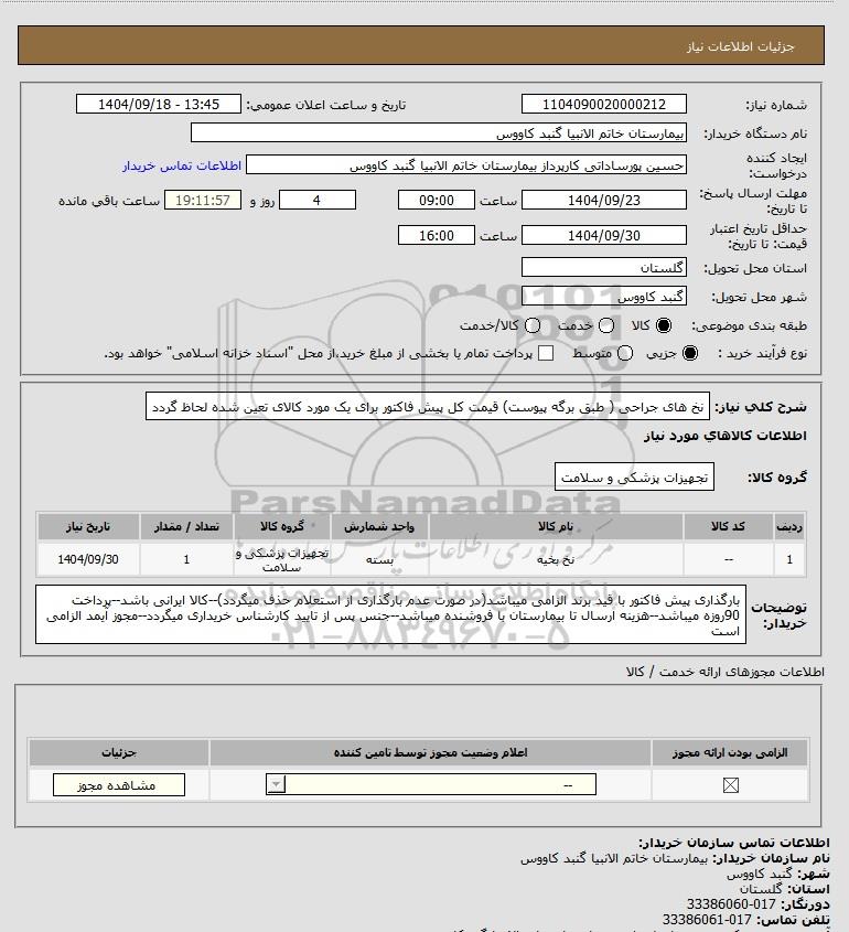 1 -- نخ بخیه بسته تجهیزات پزشکی و سلامت 1 1404/09/30