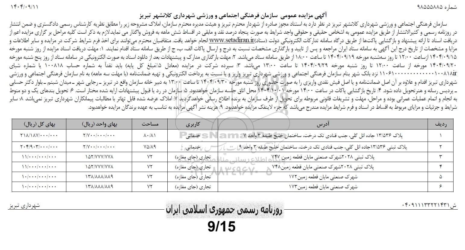 سازمان فرهنگی اجتماعی و ورزشی شهرداری کلانشهر تبریز در نظر دارد به استناد مجوز صادره از شهردار محترم تبریز و هیئت مدیره محترم سازمان املاک مشروحه زیر را مطابق نظریه کارشناس رسمی دادگستری و ضمن انتشار در روزنامه رسمی و کثیر الانتشار از طریق مزایده عمومی به اشخاص حقیقی و حقوقی واجد شرایط به صورت پنجاه درصد نقد و مابقی در اقساط شش ماهه به فروش واگذار می نماید. لازم به ذکر است کلیه مراحل برگزاری مزایده اعم از دریافت اسناد تا ارائه پیشنهاد و بازگشایی پاکت ها از طریق درگاه سامانه تدارکات الکترونیکی دولت (ستاد) ستاد ایران انجام خواهد یافت. متقاضیان محترم می توانند برای اخذ فرم شرایط شرکت در مزایده و سایر اطلاعات و مزایا و مشخصات از تاریخ درج این آگهی به سامانه ستاد ایران مراجعه و پس از تایید و بارگذاری مشخصات نسبت به درج و ارسال پاکات الف، ب ، ج از طریق سامانه ستاد اقدام نمایند. 1- مهلت دریافت اسناد مزایده از روز شنبه مورخه 1404.09.15 از ساعت 12:00 تا روز سه شنبه مورخه 1404.09.19 تا ساعت 18:00 از طریق سامانه ستاد می باشد 2- مهلت بارگذاری مدارک و پیشنهادات بعد از دانلود اسناد به صورت الکترونیکی در سامانه ستاد از روز پنج شنبه مورخه 1404.09.20 مورخه از ساعت 12:00 تا روز شنبه مورخه 1404.09.29 تا ساعت 13:00 می باشد. 3- سپرده شرکت در مزایده (معادل 5% مبلغ کل پایه) باید نقداً به شماره حساب 100818 با شماره شبای IR110610000000000000100818 نزد بانک شهر بنام سازمان فرهنگی اجتماعی و ورزشی شهرداری تبریز واریز و یا نسبت به پرداخت الکترونیکی و تهیه ضمانت نامه (با مهلت سه ماهه) به نام سازمان فرهنگی اجتماعی و ورزشی شهرداری تبریز اقدام و علاوه بر آن اصل ضمانت نامه و یا اصل فیش نقدی واریزی را به صورت حضوری روز شنبه مورخه 1404.09.30 تا ساعت 13:00 به دبیرخانه سازمان واقع در تبریز - رجایی شهر - میدان شبنم - بلوار دکتر حسابی پردیس رسانه و هنر تحویل داده شود. 4- تاریخ بازگشایی پاکات در ساعت 14:00 مورخه 1404.10.01 محل اتاق جلسه سازمان خواهد بود. 5 - سازمان در رد یا قبول پیشنهادات ارایه شده مختار است. 6- تحویل بندهای یک و دو منوط به انجام و اتمام عملیات عمرانی بوده و مراحل مهلت و تشریفات قانونی مربوطه برای تحویل از طرف سازمان به برنده اطلاع رسانی خواهد گردید 7- املاک عرضه شده قابل تهاتر با مطالبات پیمانکاران شهرداری تبریز نمی باشد 8- سایر شرایط و جزئیات و مزایای مربوط به اقساط در اسناد و فرم شرایط مزایده مندرج میباشد که جزء لاینفک مزایده خواهد بود 9- هزینه نشر آگهی مزایده به تناسب به عهده برندگان مزایده خواهد بود.
