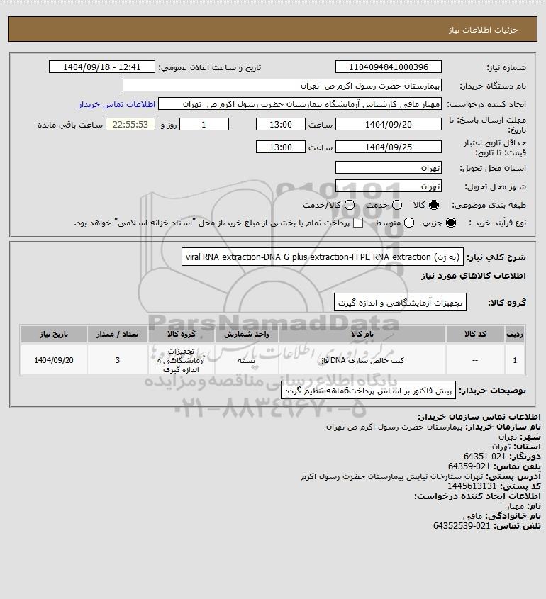 استعلام بها و موضوع استعلام استعلام (به ژن) viral RNA extraction-DNA G plus extraction-FFPE RNA extraction به اطلاع کلیه شرکتها و افراد متخصص واجد شرایط میرساند، آگهی گذار در نظر دارد از طریق استعلام بها، نسبت به انتخاب و دریافت پیشنهادات اقدام نماید. این استعلام با کد آگهی ثبت شده در سامانه خبرگزاری پارس نماد : 9970212 منتشر شده است. مشخصات استعلام : تاریخ شروع استعلام: 1404/09/18 آخرین مهلت ارسال پیشنهاد قیمت : 1404/09/20 و محل اجرای پروژه : استان تهران میباشد. استعلام قیمت مورد درخواست : استعلام (به ژن) viral RNA extraction-DNA G plus extraction-FFPE RNA extraction با دستهبندیهای تخصصی و گروه های مرتبط : خدمات و تجهیزات آزمایشگاهی و پزشکی, استعلام اطلاع رسانی میگردد.