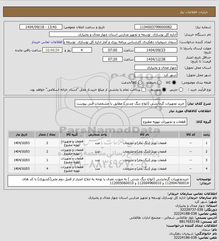| 2 | -- | قطعات بویلر (دیگ بخار) و ملزومات | عدد | قطعات و تجهیزات تهویه مطبوع | 2 | 1404/10/03 |