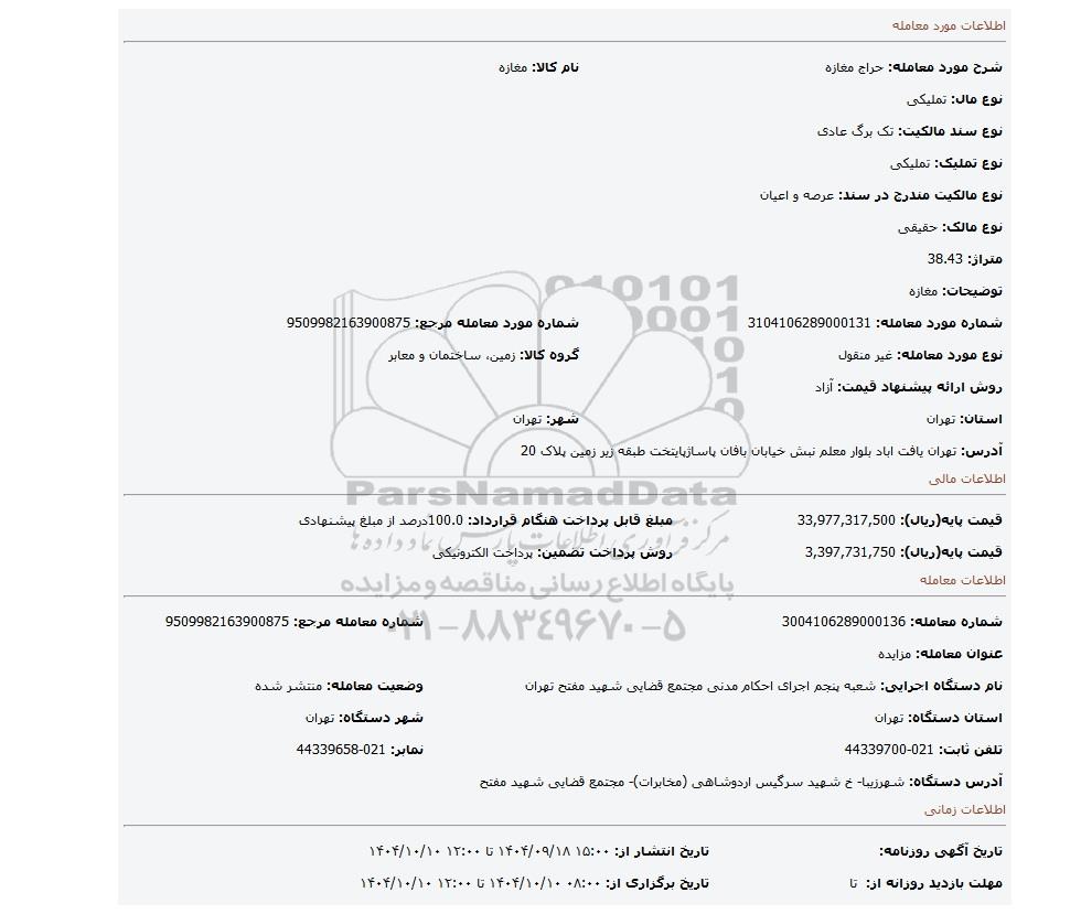 نام دستگاه اجرایی: شعبه پنجم اجرای احکام مدنی مجتمع قضایی شهید مفتح تهرانوضعیت معامله: منتشر شده