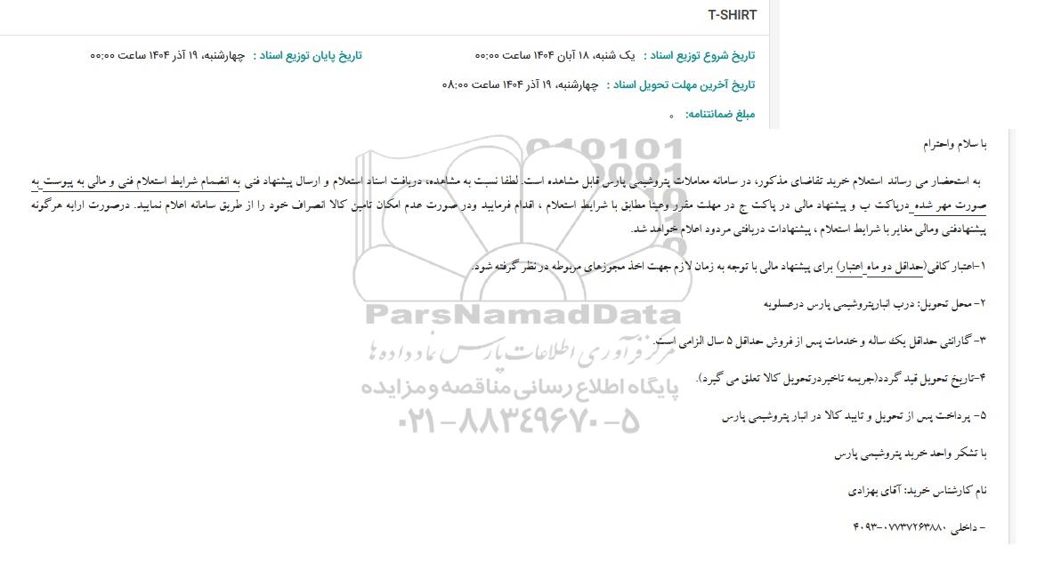 استعلام بها و موضوع استعلام استعلام T-SHIRT به اطلاع کلیه شرکتها و افراد متخصص واجد شرایط میرساند، آگهی گذار در نظر دارد از طریق استعلام بها، نسبت به انتخاب و دریافت پیشنهادات اقدام نماید. این استعلام با کد آگهی ثبت شده در سامانه خبرگزاری پارس نماد : 9970716 منتشر شده است. مشخصات استعلام : تاریخ شروع استعلام: 1404/09/19 آخرین مهلت ارسال پیشنهاد قیمت : 1404/09/19 و محل اجرای پروژه : استان بوشهر میباشد. استعلام قیمت مورد درخواست : استعلام T-SHIRT با دستهبندیهای تخصصی و گروه های مرتبط : البسه و پوشاک, استعلام اطلاع رسانی میگردد.
