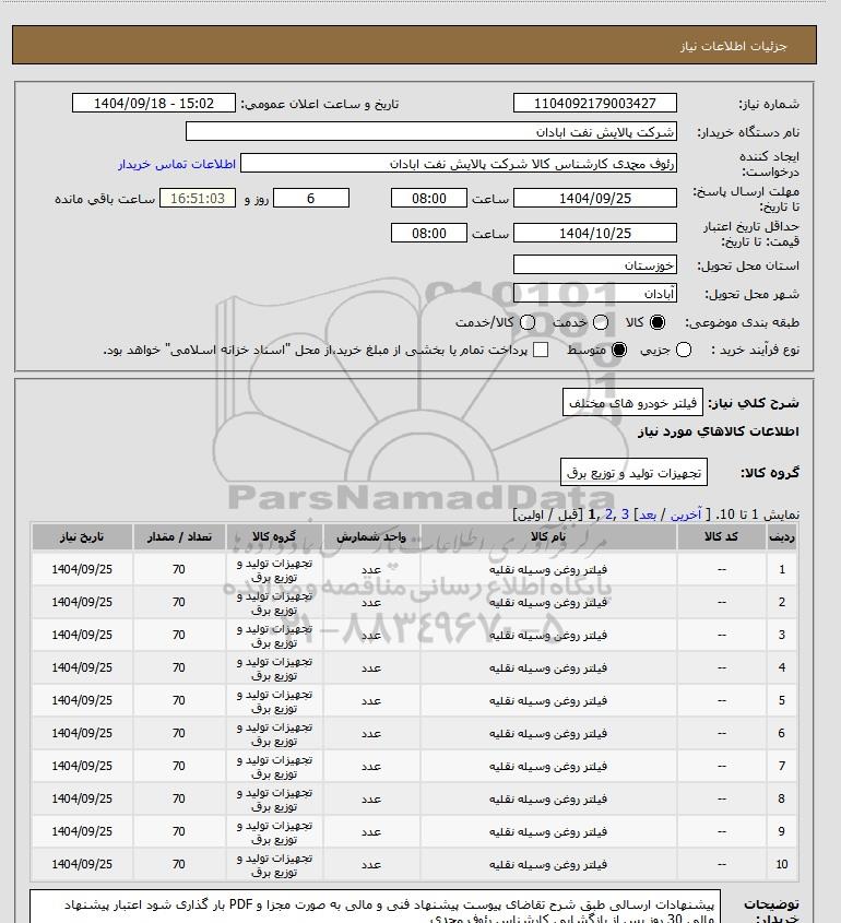 | 7 | -- | فیلتر روغن وسیله نقلیه | عدد | تجهیزات تولید و توزیع برق | 70 | 1404/09/25 |