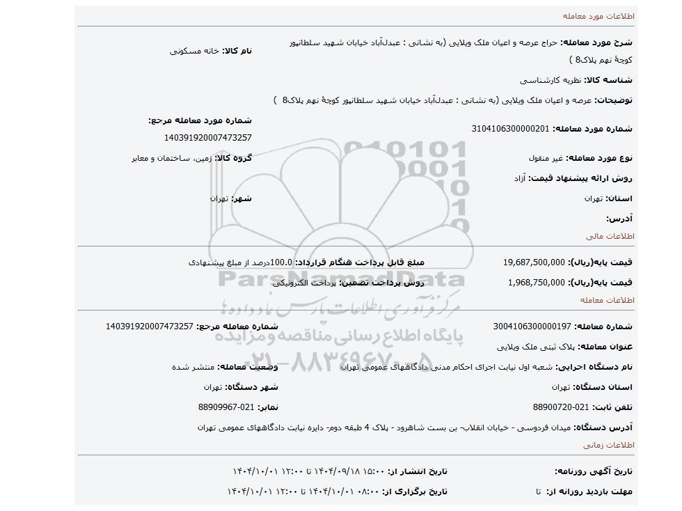 | نام دستگاه اجرایی: شعبه اول نیابت اجرای احکام مدنی دادگاههای عمومی تهران | وضعیت معامله: منتشر شده | |