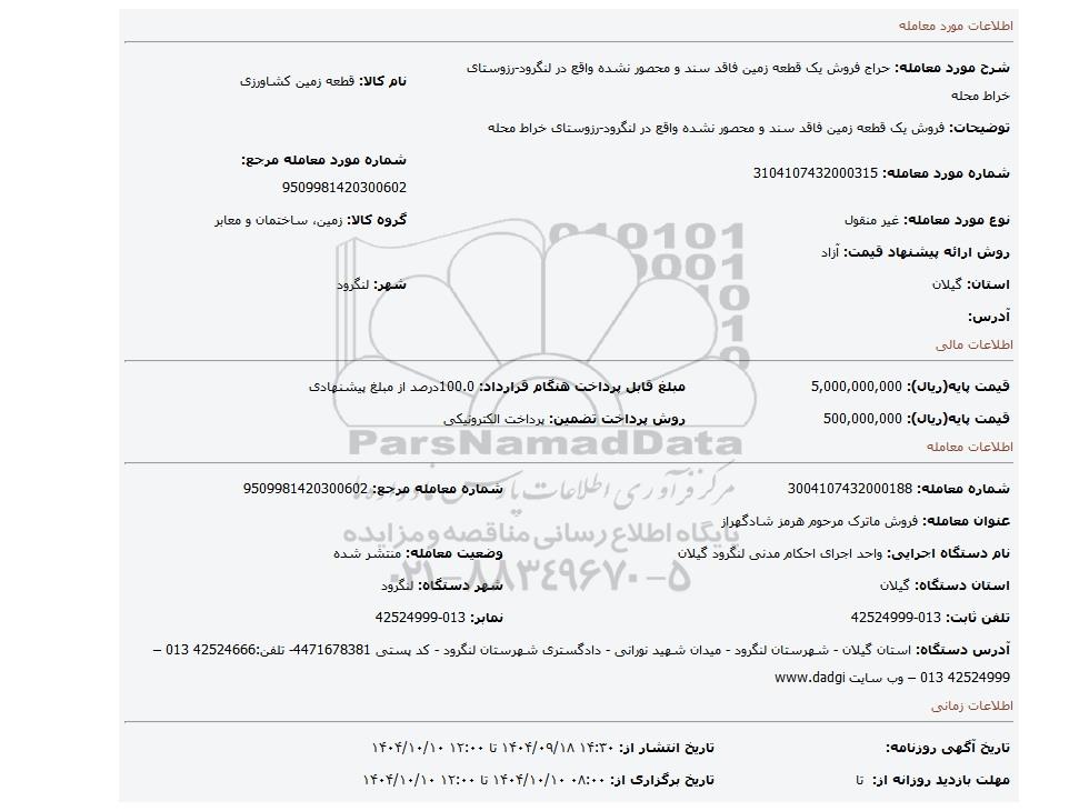 مزایده، فروش یک قطعه زمین فاقد سند و محصور نشده واقع در لنگرود-رزوستای خراط محله