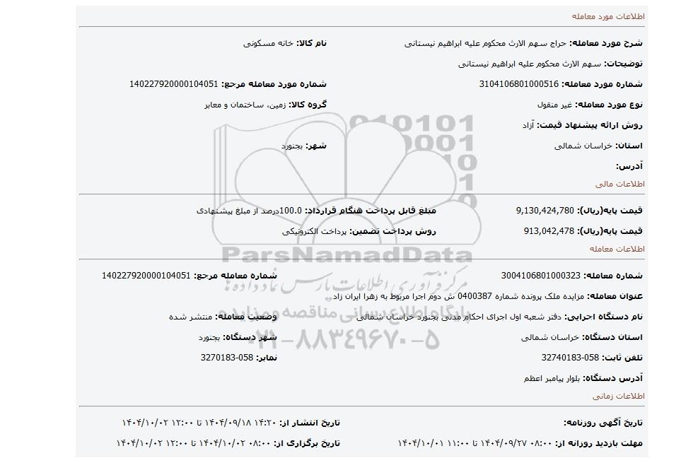 مزایده عمومی مزایده سهم الارث محکوم علیه ابراهیم نیستانی برگزار میگردد. از کلیه افراد متخصص و شرکتهای واجد شرایط دعوت به عمل میآید تا در این مزایده با کد خبرگزاری پارس نماد : 9970758 شرکت نمایند تاریخ شروع مزایده : 1404/09/18 مهلت شرکت در مزایده: تا پایان روز 1404/10/02 مکان برگزاری اموال واگذاری استانهای مزایدات استان خراسان شمالی و دستهبندیهای مربوط به این حراجی املاک و زمین میباشد.