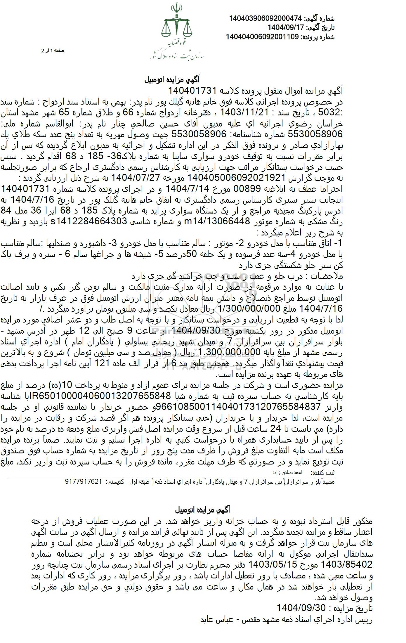 لذا با توجه به قطعیت ارزیابی و درخواست بستانکار و با توجه به اصل طلب و دو عشر اضافی مورد مزایده اتومبیل مذکور در روز یکشنبه مورخ 1404.09.30 از ساعت 9 صبح الى 12 ظهر در آدرس مشهد -بلوار سرافرازان بین سرافرازان 7 و میدان شهید ریحانی یساولی ) یادگاران امام ) اداره اجرای اسناد رسمی مشهد از مبلغ پایه 1.300.000.000 ریال ) معادل صد و سی میلیون تومان ) شروع و به بالاترین قیمت پیشنهادی نقدا واگذار میگردد. همچنین طبق بند 6 از فراز الف ماده 121 آیین نامه اجرا پرداخت بدهی های مربوطه به عهده برنده مزایده است.