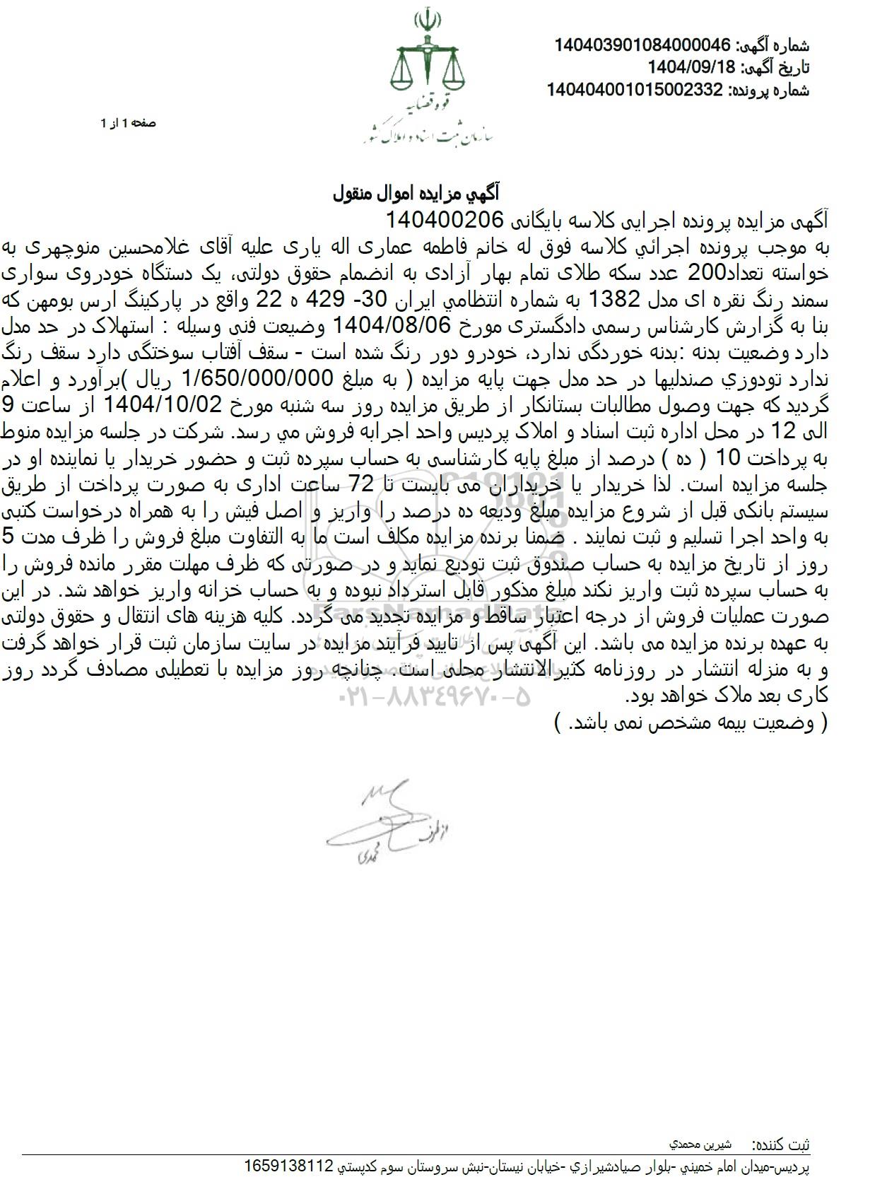 به موجب پرونده اجرائی کلاسه فوق له خانم فاطمه عماری اله یاری علیه آقای غلامحسین منوچهری به خواسته تعداد 200 عدد سکه طلای تمام بهار آزادی به انضمام حقوق دولتی یک دستگاه خودروی سواری سمند رنگ نقره ای مدل 1382 به شماره انتظامی ایران - 220429 واقع در پارکینگ ارس بومهن که بنا به گزارش کارشناس رسمی دادگستری مورخ 1404.08.06 وضیعت فنی وسیله : استهلاک در حد مدل دارد وضعیت بدنه : بدنه خوردگی ندارد خودرو دور رنگ شده است - سقف آفتاب سوختگی دارد سقف رنگ ندارد تودوزی صندلیها در حد مدل جهت پایه مزایده ) به مبلغ 1.650.000.000 ریال برآورد و اعلام گردید که جهت وصول مطالبات بستانکار از طریق مزایده روز سه شنبه مورخ 1404.10.02 از ساعت 9 الی 12 در محل اداره ثبت اسناد و املاک پردیس واحد اجرا به فروش می رسد شرکت در جلسه مزایده منوط به پرداخت 10 ) ده ( درصد از مبلغ پایه کارشناسی به حساب سپرده ثبت و حضور خریدار یا نماینده او در جلسه مزایده است. لذا خریدار یا خریداران می بایست تا 72 ساعت اداری به صورت پرداخت از طریق سیستم بانکی قبل از شروع مزایده مبلغ ودیعه ده درصد را واریز و اصل فیش را به همراه درخواست کتبی به واحد اجرا تسلیم و ثبت نمایند. ضمنا برنده مزایده مکلف است ما به التفاوت مبلغ فروش را ظرف مدت 5 روز از تاریخ مزایده به حساب صندوق ثبت تودیع نماید و در صورتی که ظرف مهلت مقرر مانده فروش را به حساب سپرده ثبت واریز نکند مبلغ مذکور قابل استرداد نبوده و به حساب خزانه واریز خواهد شد. در این صورت عملیات فروش از درجه اعتبار ساقط و مزایده تجدید میگردد. کلیه هزینه های انتقال و حقوق دولتی به عهده برنده مزایده می باشد. این آگهی پس از تایید فرآیند مزایده در سایت سازمان ثبت قرار خواهد گرفت و به منزله انتشار در روزنامه کثیر الانتشار محلی است. چنانچه روز مزایده با تعطیلی مصادف گردد روز کاری بعد ملاک خواهد بود.