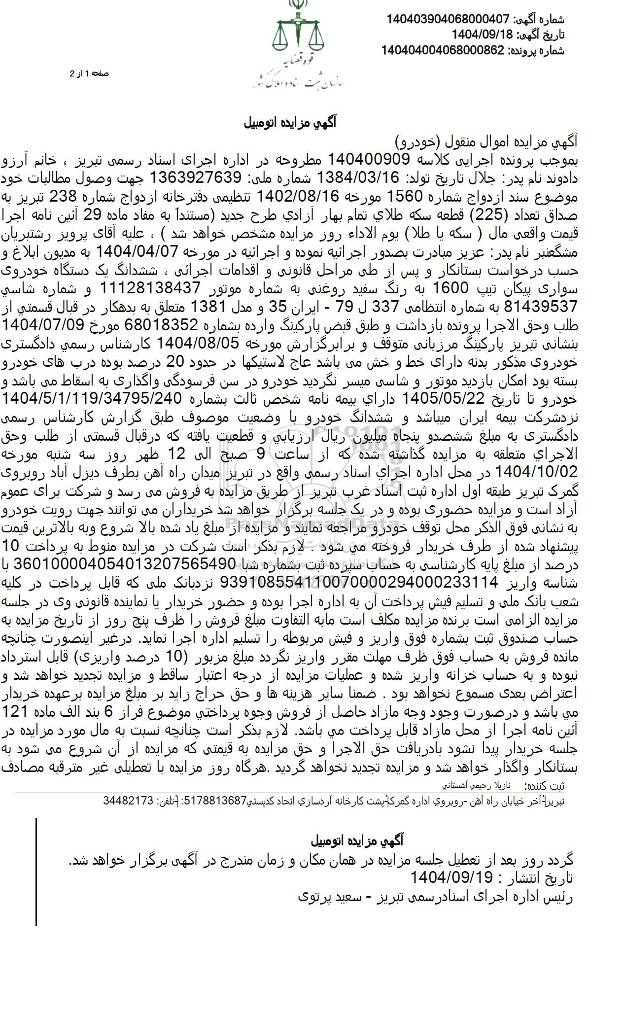 بموجب پرونده اجرایی کلاسه 140400909 مطروحه در اداره اجرای اسناد رسمی تبریز ، خانم آرزو دادوند نام پدر جلال تاریخ تولد: 1384/03/16 شماره ملی 1363927639 جهت وصول مطالبات خود موضوع سند ازدواج شماره 1560 مورخه 1402/08/16 تنظیمی دفترخانه ازدواج شماره 238 تبریز به صداق تعداد (225) قطعه سكه طلای تمام بهار آزادی طرح جدید (مستنداً به مفاد ماده 29 آئین نامه اجرا قیمت واقعی مال ( سكه یا طلا) یوم الاداء روز مزایده مشخص خواهد شد ) ، علیه آقای پرویز رشتبریان مشگعتبر نام پدر عزیز مبادرت بصدور اجرائیه نموده و اجرائیه در مورخه 1404/04/07 به مدیون ابلاغ و حسب درخواست بستانکار و پس از طی مراحل قانونی و اقدامات اجرائی ، ششدانگ یک دستگاه خودروی سواری پیکان تیپ 1600 به رنگ سفید روغنی به شماره موتور 11128138437 و شماره شاسی 81439537 به شماره انتظامی 337 ل 79 - ایران 35 و مدل 1381 متعلق به بدهکار در قبال قسمتی از طلب وحق الاجرا پرونده بازداشت و طبق قبض پارکینگ وارده بشماره 68018352 مورخ 1404/07/09 بنشانی تبریز پارکینگ مرزبانی متوقف و برابرگزارش مورخه 1404/08/05 کارشناس رسمی دادگستری خودروی مذکور بدنه دارای خط و خش میباشد عاج لاستیکها در حدود 20 درصد بوده درب های خودرو بسته بود امکان بازدید موتور و شاسی میسر نگردید خودرو در سن فرسودگی واگذاری به اسقاط می باشد و خودرو تا تاریخ 1405/05/22 دارای بیمه نامه شخص ثالث بشماره 1404/5/1/119/34795/240 نزد شرکت بیمه ایران میباشد و ششدانگ خودرو با وضعیت موصوف طبق گزارش کارشناس رسمی دادگستری به مبلغ ششصد و پنجاه میلیون ریال ارزیابی و قطعیت یافته که در قبال قسمتی از طلب وحق الاجرای متعلقه به مزایده گذاشته شده که از ساعت 9 صبح الی 12 ظهر روز سه شنبه مورخه 1404.10.02 در محل اداره اجرای اسناد رسمی واقع در تبریز میدان راه آهن بطرف دیزل آباد روبروی گمرک تبریز طبقه اول اداره ثبت اسناد غرب تبریز از طریق مزایده به فروش به فروش میرسد و شرکت برای عموم آزاد است و مزایده حضوری بوده و در یک جلسه برگزار خواهد شد خریداران میتوانند جهت رویت خودرو به نشانی فوق الذكر محل توقف خودرو مراجعه نمایند و مزایده از مبلغ یاد شده بالا شروع و به بالاترین قیمت پیشنهاد شده از طرف خریدار فروخته می شود . لازم بذکر است شرکت در مزایده منوط به پرداخت 10 درصد از مبلغ پایه کارشناسی به حساب سپرده ثبت بشماره شبا 360100004054013207565490 با شناسه واریز 939108554110070000294000233114 نردبانک ملی که قابل پرداخت در کلیه شعب بانک ملی و تسلیم فیش پرداخت آن به اداره اجرا بوده و حضور خریدار با نماینده قانونی وی در جلسه مزایده الزامی است برنده مزایده مکلف است ما به التفاوت مبلغ فروش را ظرف پنج روز از تاریخ مزایده به حساب صندوق ثبت بشماره فوق واریز و فیش مربوطه را تسلیم اداره اجرا نماید. در غیر اینصورت چنانچه مانده فروش به حساب فوق ظرف مهلت مقرر واریز نگردد مبلغ مزبور (10) درصد واریزی قابل استرداد نبوده و به حساب خزانه واریز شده و عملیات مزایده از درجه اعتبار ساقط و مزایده تجدید خواهد شد و اعتراض بعدی مسموع نخواهد بود. ضمنا سایر هزینه ها و حق حراج راید بر مبلغ مزایده بر عهده خریدار می باشد و در صورت وجود وجه مازاد حاصل از فروش وجوه پرداختی موضوع فرار 6 بند الف ماده 121 آئین نامه اجرا از محل مازاد قابل پرداخت میباشد. لازم بذکر است چنانچه نسبت به مال مورد مزایده در جلسه خریدار پیدا نشود با دریافت حق الاجرا و حق مزایده به قیمتی که مزایده از آن شروع می شود به بستانکار واگذار خواهد شد و مزایده تجدید نخواهد گردید. هرگاه روز مزایده با تعطیلی غیر مترقبه مصادف گردد روز بعد از تعطیل جلسه مزایده در همان مکان و زمان مندرج در آگهی برگزار خواهد شد.