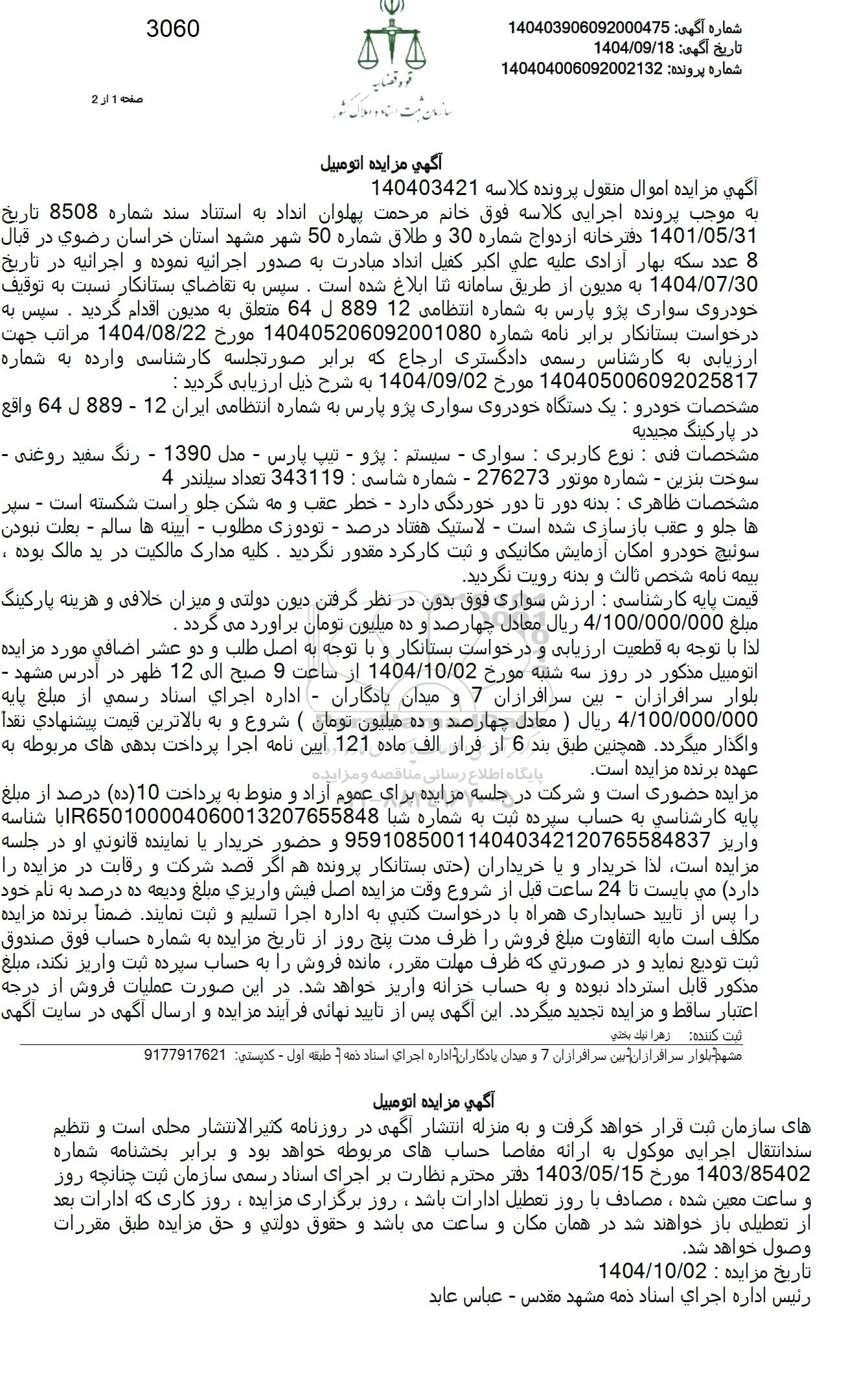 لذا با توجه به قطعیت ارزیابی و درخواست بستانکار و با توجه به اصل طلب و دو عشر اضافي مورد مزایده اتومبیل مذکور در روز سه شنبه مورخ 1404.10.02 از ساعت 9 صبح الی 12 ظهر در آدرس مشهد -بلوار سرافرازان بین سرافرازان 7 و میدان یادگاران - اداره اجرای اسناد رسمي از مبلغ پایه 4.100.000.000 ريال ) معادل چهارصد و ده میلیون تومان ( شروع و به بالاترین قیمت پیشنهادی نقدا واگذار میگردد. همچنین طبق بند 6 از فراز الف ماده 121 آیین نامه اجرا پرداخت بدهی های مربوطه به عهده برنده مزایده است.