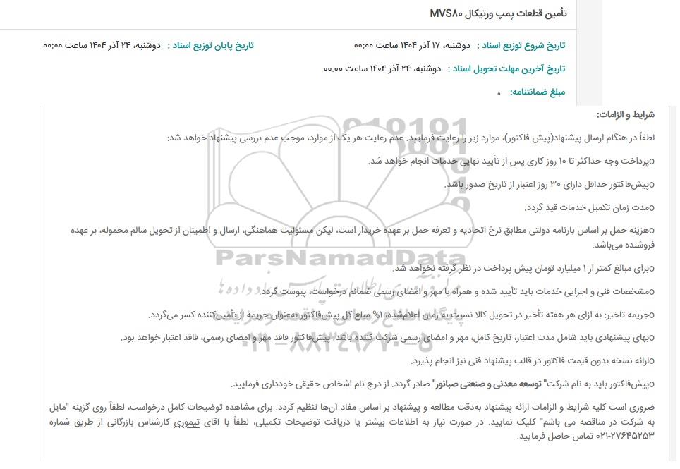 استعلام بها و موضوع استعلام استعلام تأمین قطعات پمپ ورتیکال MVS80 به اطلاع کلیه شرکتها و افراد متخصص واجد شرایط میرساند، آگهی گذار در نظر دارد از طریق استعلام بها، نسبت به انتخاب و دریافت پیشنهادات اقدام نماید. این استعلام با کد آگهی ثبت شده در سامانه خبرگزاری پارس نماد : 9970904 منتشر شده است. مشخصات استعلام : تاریخ شروع استعلام: 1404/09/18 آخرین مهلت ارسال پیشنهاد قیمت : 1404/09/24 و محل اجرای پروژه : استان مناقصات استان تهران میباشد. استعلام قیمت مورد درخواست : استعلام تأمین قطعات پمپ ورتیکال MVS80 با دستهبندیهای تخصصی و گروه های مرتبط : الکتروموتور و پمپ های شناور, تجهیزات و ماشین آلات صنعتی, تجهیزات و ماشین آلات حفاری, استعلام اطلاع رسانی میگردد.