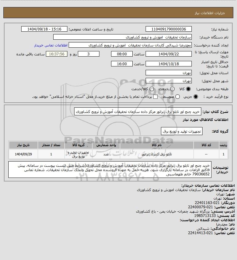 شرح کلی نیاز: خرید چنج اور تابلو برق ژنراتور مرکز داده سازمان تحقیقات آموزش و ترویج کشاورزی