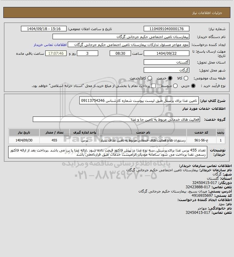 شرح کلی نیاز: تامین غذا برای پرسنل طبق لیست پیوست شماره کارشناس 09113754246