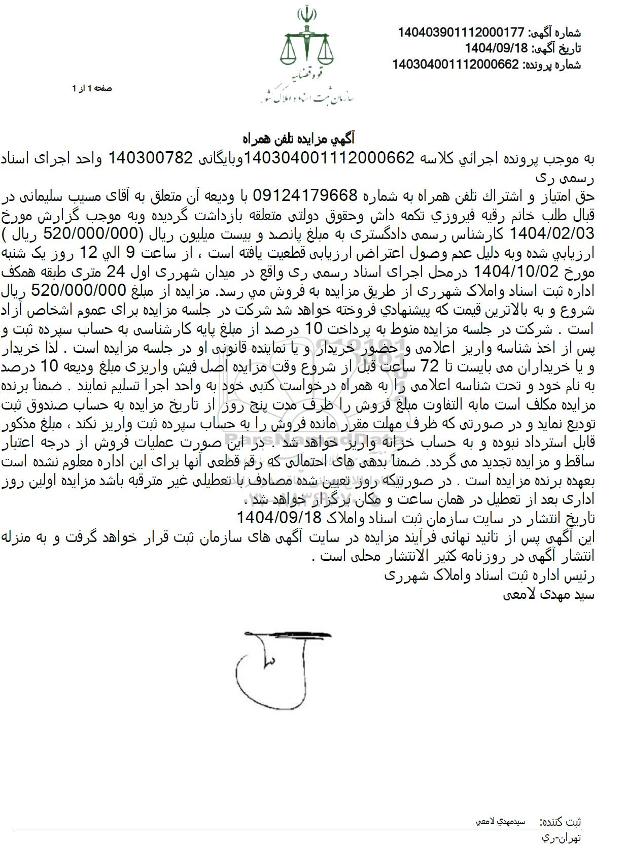به موجب پرونده اجرائي كلاسه 140304001112000662 و بایگانی 140300782 واحد اجرای اسناد رسمی ری