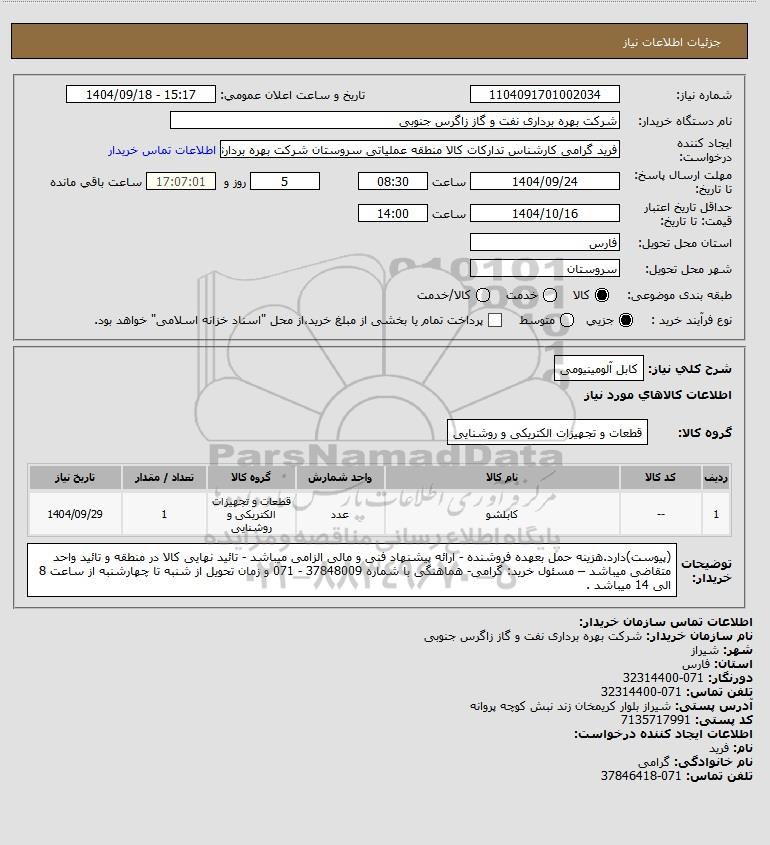 | 1 | -- | کابلشو | عدد | قطعات و تجهیزات الکتریکی و روشنایی | 1 | 1404/09/29 |