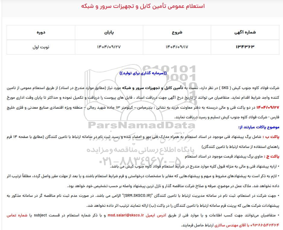 شرکت فولاد کاوه جنوب کیش ( SKS ) در نظر دارد نسبت به تامین کابل و تجهیزات سرور و شبکه (مطابق موارد مندرج در اسناد) از طریق استعلام عمومی از مشاوران واجد شرایط اقدام نماید. متقاضیان می توانند از تاریخ درج آگهی جهت دریافت اسناد موضوع فوق، فایل های پیوست را دریافت و تکمیل نموده و حداکثر تا قبل از پایان وقت اداری روز 1404.9.27 در دو پاکت دربسته (پاکت ب و پاکت ج ) به دفتر معاونت خرید ( به نشانی : بندرعباس – کیلومتر 13 جاده شهید رجائی – منطقه ویژه اقتصادی صنایع معدنی و فلزی خلیج فارس - شرکت فولاد کاوه جنوب کیش) تسلیم و رسید دریافت نمایند.