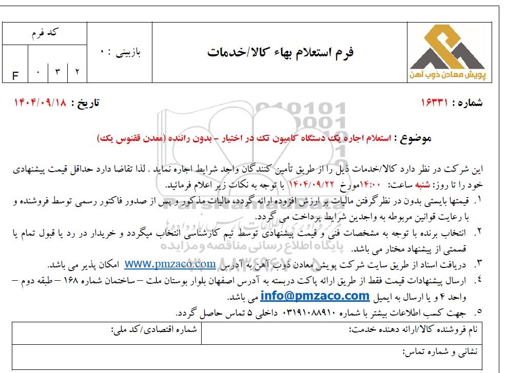 این شرکت در نظر دارد کالا / خدمات ذیل را از طریق تأمین کنندگان واجد شرایط اجاره نماید. لذا تقاضا دارد حداقل قیمت پیشنهادی خود را تا روز: شنبه ساعت: 14:00 ظهر مورخ: 1404.09.22 با توجه به نکات زیر اعلام فرمائید.