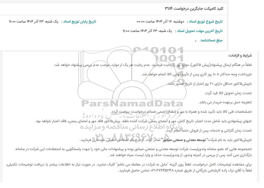 در صورت نیاز به دریافت راهنمایی یا پشتیبانی در خصوص استعلام و مناقصه و فراخوان مناقصه عمومی، مناقصه محدود، مناقصه بین المللی، مناقصه دولتی، مناقصه خصوصی، مناقصه آنلاین فروش تجهیزات، مناقصه مشاورهای مناقصه پتروشیمی و انرژی مناقصه صنایع و تجهیزات برق و مخابرات و نفت و گاز ... لطفاً با سایت خبری مناقصه و مزایده پارسنماد دادهها به شماره 88349670 تماس حاصل فرمایید.