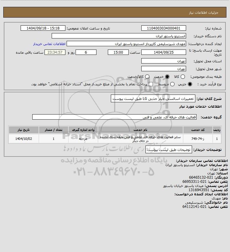 شرح کلی نیاز: تعمییرات اسالسی چیلر جذبی LG طبق لیست پیوست