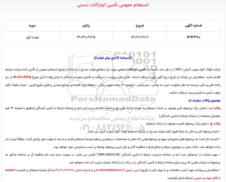شرکت فولاد کاوه جنوب کیش ( SKS ) در نظر دارد نسبت به تامین آچارآلات د ستی (مطابق موارد مندرج در اسناد) از طریق استعلام عمومی از مشاوران واجد شرایط اقدام نماید. متقاضیان می توانند از تاریخ درج آگهی جهت دریافت اسناد موضوع فوق، فایل های پیوست را دریافت و تکمیل نموده و حداکثر تا قبل از پایان وقت اداری روز 1404.9.25 در دو پاکت دربسته (پاکت ب و پاکت ج ) به دفتر معاونت خرید ( به نشانی : بندرعباس – کیلومتر 13 جاده شهید رجائی – منطقه ویژه اقتصادی صنایع معدنی و فلزی خلیج فارس - شرکت فولاد کاوه جنوب کیش) تسلیم و رسید دریافت نمایند.