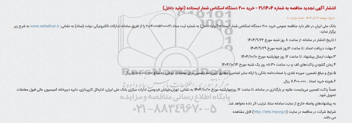 بانک ملی ایران در نظر دارد مناقصه عمومی خرید 200 دستگاه اسکناس شمار ایستاده (تولید داخل) به شماره ثبت ستاد 2004001056000021 را از طریق سامانه تدارکات الکترونیکی دولت (ستاد) ایران به شرح زیر برگزار نماید: