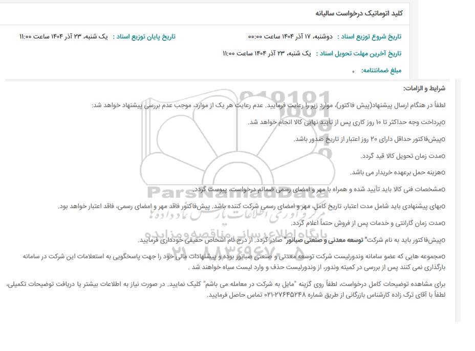 در صورت نیاز به دریافت راهنمایی یا پشتیبانی در خصوص استعلام و مناقصه و فراخوان مناقصه عمومی، مناقصه محدود، مناقصه بین المللی، مناقصه دولتی، مناقصه خصوصی، مناقصه آنلاین فروش تجهیزات، مناقصه مشاورهای مناقصه پتروشیمی و انرژی مناقصه صنایع و تجهیزات برق و مخابرات و نفت و گاز ... لطفاً با سایت خبری مناقصه و مزایده پارسنماد دادهها به شماره 88349670 تماس حاصل فرمایید.