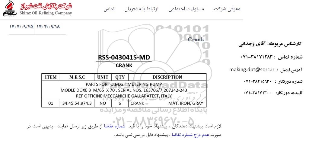 استعلام CRANK از کلیه افراد متخصص و شرکتها واجد شرایط دعوت به عمل میآید در مناقصه با کد خبرگزاری پارس نماد: 9970956 شرکت نمایند.