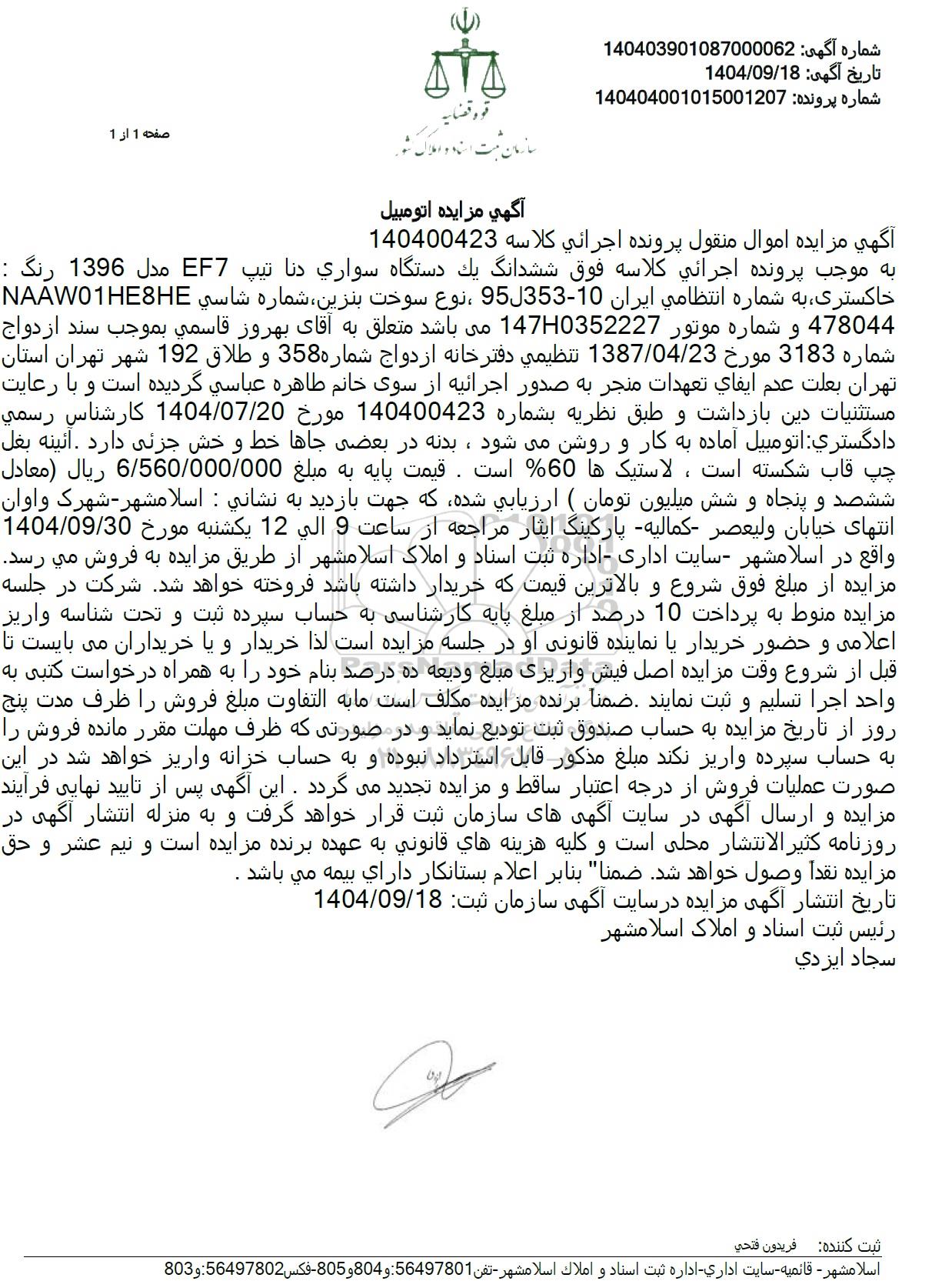 به موجب پرونده اجرائي کلاسه فوق ششدانگ يک دستگاه سواری دنا تیپ EF7 مدل 1396 رنگ : خاکستری به شماره انتظامي ايران 10-95353 ، نوع سوخت بنزین شماره شاسي NAAW01HE8E 478044 و شماره موتور 1470352227 می باشد متعلق به آقای بهروز قاسمی بموجب سند ازدواج شماره 3183 مورخ 1387.04.23 تنظيمي دفترخانه ازدواج شماره 358 و طلاق 192 شهر تهران استان تهران بعلت عدم ايفاي تعهدات منجر به صدور اجرائیه از سوی خانم طاهره عباسی گردیده است و با رعایت مستثنیات دین بازداشت و طبق نظریه بشماره 140400423 مورخ 1404.07.20 کارشناس رسمي دادگستری اتومبیل آماده به کار و روشن میشود ، بدنه در بعضی جاها خط و خش جزئی دارد . آئینه بغل چپ قاب شکسته است ، لاستیک ها %60 است. قیمت پایه به مبلغ 6.560.000.000 ريال (معادل ششصد و پنجاه و شش میلیون تومان ( ارزیابی شده که جهت بازدید به نشانی : اسلامشهر - شهرک واوان انتهای خیابان ولیعصر -کمالیه پارکینگ ایثار مراجعه از ساعت 9 الي 12 يكشنبه مورخ 1404.09.30 واقع در اسلامشهر - سایت اداری اداره ثبت اسناد و املاک اسلامشهر از طریق مزایده به فروش می رسد. مزایده از مبلغ فوق شروع و بالاترین قیمت که خریدار داشته باشد فروخته خواهد شد. شرکت در جلسه مزایده منوط به پرداخت 10 درصد از مبلغ پایه کارشناسی به حساب سپرده ثبت و تحت شناسه واریز اعلامی و حضور خریدار یا نماینده قانونی او در جلسه مزایده است لذا خریدار و یا خریداران می بایست تا قبل از شروع وقت مزایده اصل فیش واریزی مبلغ ودیعه ده درصد بنام خود را به همراه درخواست کتبی به واحد اجرا تسلیم و ثبت نمایند . ضمنا برنده مزایده مکلف است ما به التفاوت مبلغ فروش را ظرف مدت پنج روز از تاریخ مزایده به حساب صندوق ثبت تودیع نماید و در صورتی که ظرف مهلت مقرر مانده فروش را به حساب سپرده واریز نکند مبلغ مذکور قابل استرداد نبوده و به حساب خزانه واریز خواهد شد در این صورت عملیات فروش از درجه اعتبار ساقط و مزایده تجدید میگردد. این آگهی پس از تایید نهایی فرآیند مزایده و ارسال آگهی در سایت آگهی های سازمان ثبت قرار خواهد گرفت و به منزله انتشار آگهی در روزنامه کثیر الانتشار محلی است و کلیه هزينه هاي قانوني به عهده برنده مزایده است و نیم عشر و حق مزایده نقداً وصول خواهد شد. ضمنا بنابر اعلام بستانکار دارای بیمه می باشد .